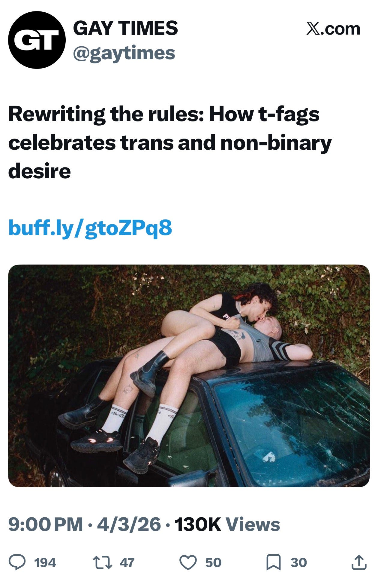They don’t even try to hide their hatred of gay men. Here’s a recent post about ‘t-fags’. Yes, the ‘Gay Times’ is celebrating women who pretend to be gay men and call themselves ‘trans fags’.