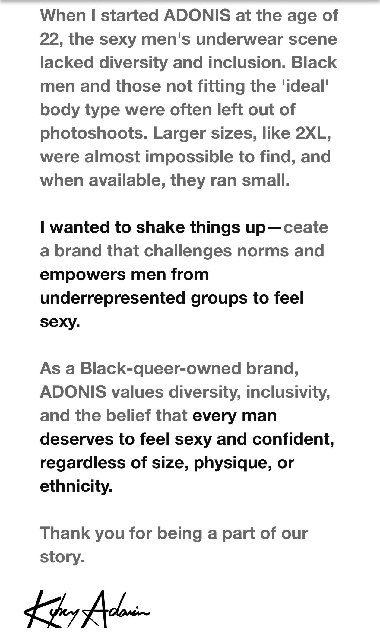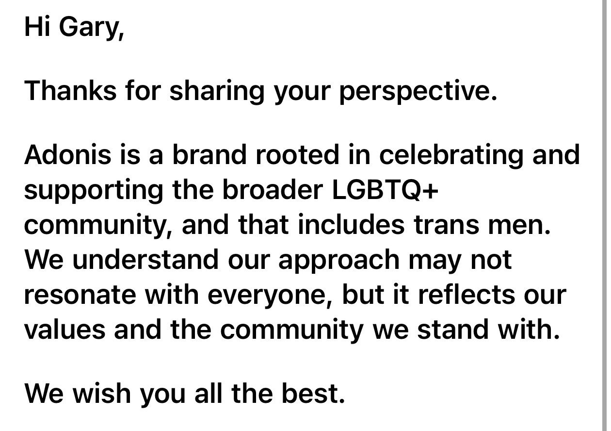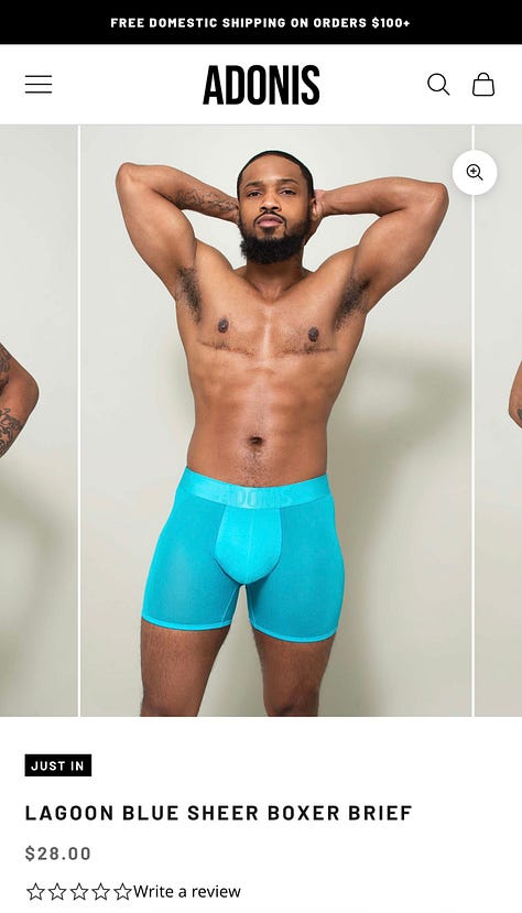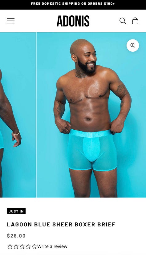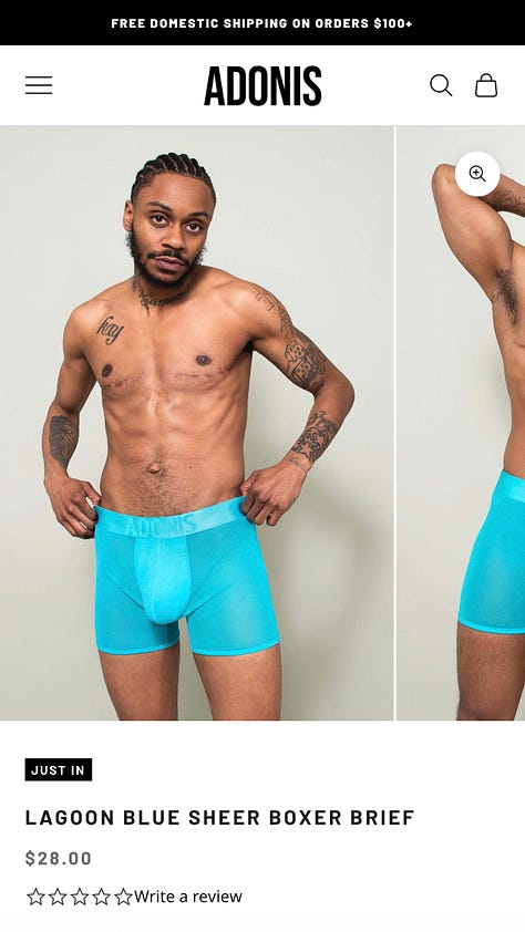 I think it’s worth noting that you will never see any white models on Adonis’ site. Their version of ‘diversity’ and ‘inclusivity’ favors women posing as men over white men. (So much for me thinking I was doing something good by ‘supporting black-owned businesses’.)