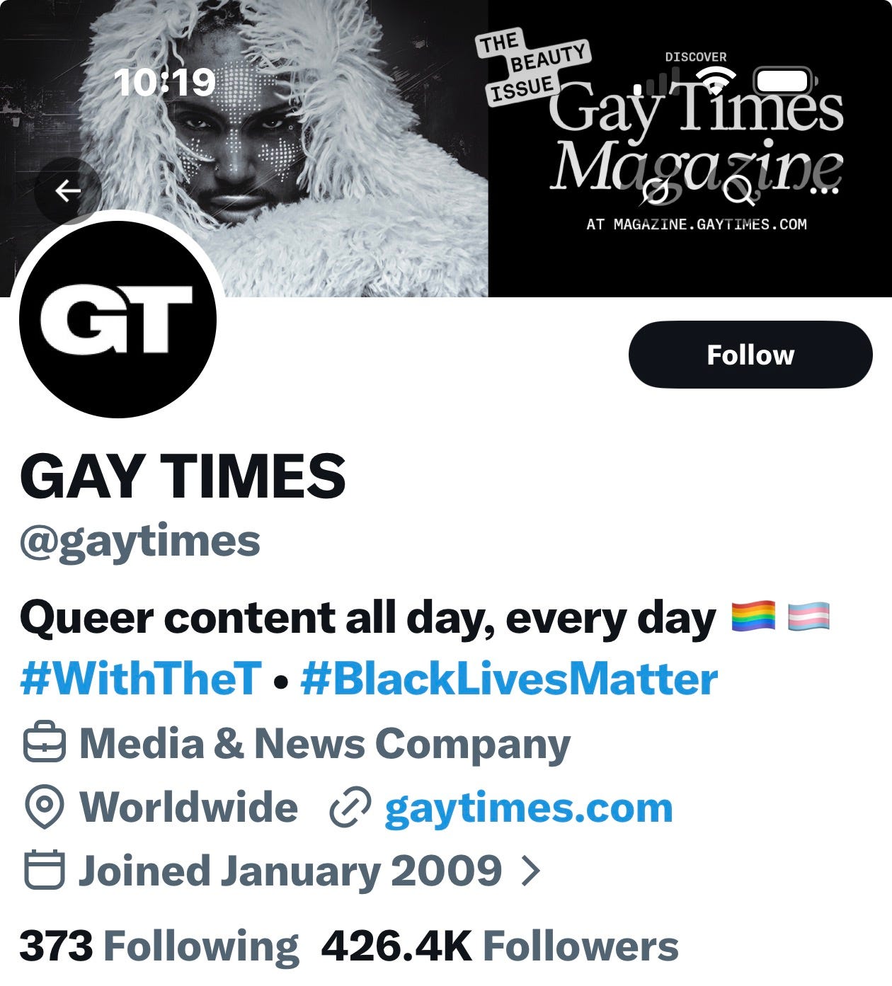 There is no gay media anymore. ALL of them are trans-centered. ALL OF THEM. So-called ‘Gay Times’ emphasizes ‘#WithTheT’.