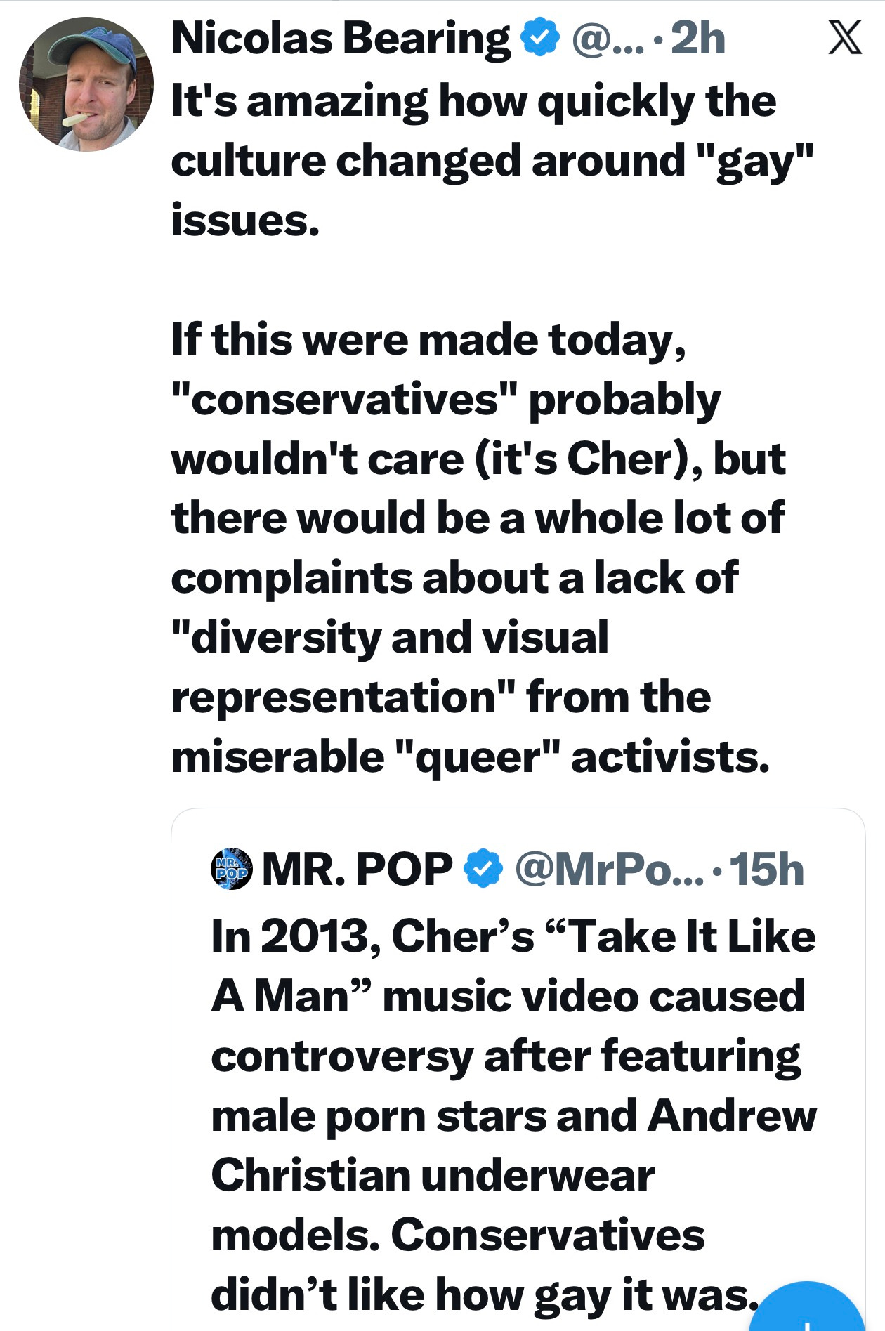 I've come to the painful conclusion that the acceptance we felt so chuffed about was only surface-deep. Beneath the surface lay the deep discomfort with same-sex desire that had always been there. Now the QT+ agenda has made it safe to bring that discomfort out in the open. Bigots can breathe easy: Just as was rumored for decades, Gay people can be understood as people "born in the wrong body." There's no difference between Gay, Bisexual and Trans and we admit as much when we accept the absurd "LGBTQQIAWTF+" acronym. And when we accept the label "queer," that reinforces even more harmful stereotypes. That throws open a door to fetishists and poseurs and pedophiles and everything under the sun. You're absolutely right - in the public mind today, there's no such thing as just being Gay and there never was. Gay = Queer, and Queer is an undifferentiated mass of abnormality. The most disturbing part for me is that, according to Queer Theory, all of these sex and gender identities are purely performative. We're just playacting, after all, so WHY NOT sleep with women posing as men, or vice-versa?
