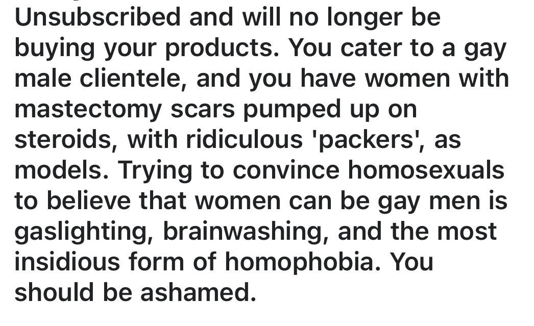 To be fair, they can sell to whomever they want. I’m sure the money from deluded women is just as good as the money from the population who actually have penises to fill that fabric in the front. But don’t gay-bait and then tell gay men they have to be OK with this.